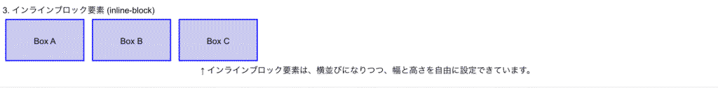 ↑ インラインブロック要素は、横並びになりつつ、幅と高さを自由に設定できています。