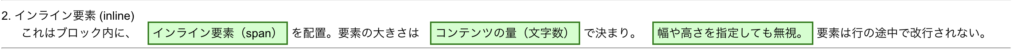 インライン要素は、文章の途中に入る要素です。改行せずに、文字の流れの中にそのまま表示されます。