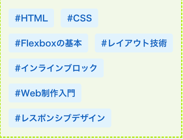 | カテゴリータグの横並び | span{ display: inline-block; } | 「[HTML] [CSS]」のようにタグを並べ、親の幅を超えたら自動で次の行に折り返してほしい場合に最適。 |