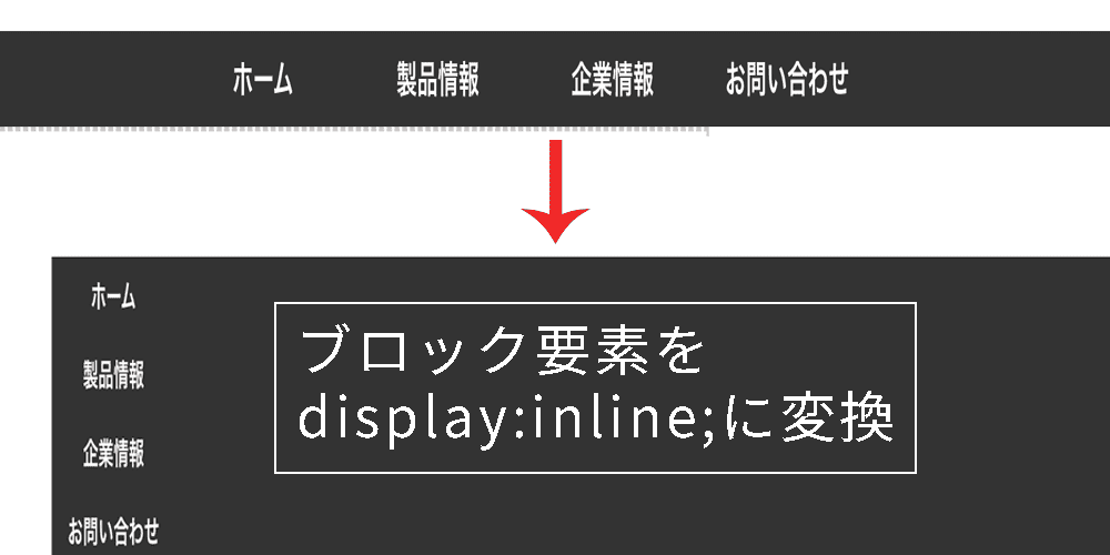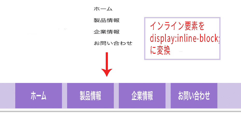 リスト 要素を用いたナビゲーションメニューを横並びにする場合、 display:inline-block;がよく使われます。
