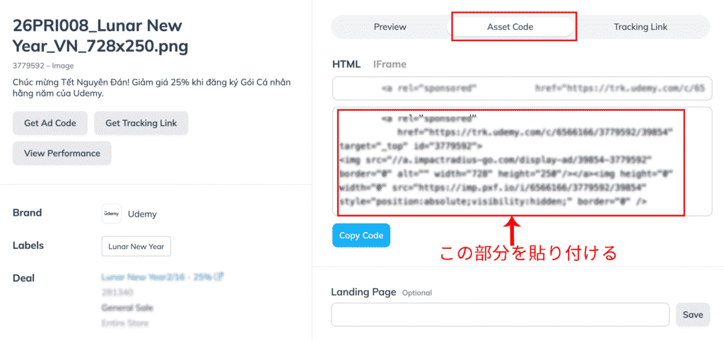 Asset Codeを選択して、アフィリエイトリンクをサイトに貼り付ける