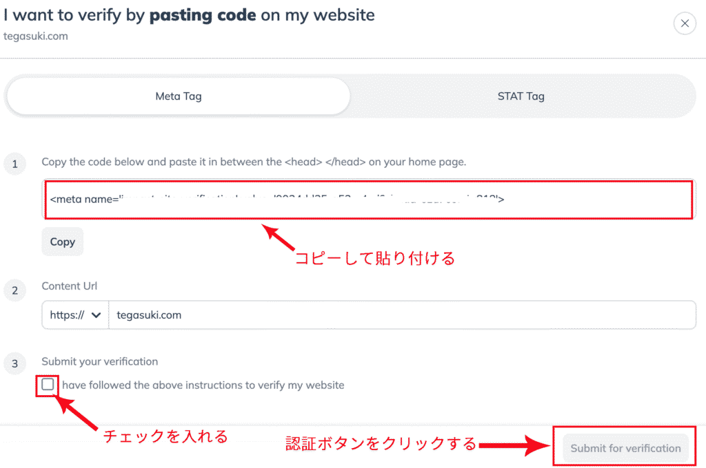 Impactの「Verify」画面で表示されるタグをコピーします。