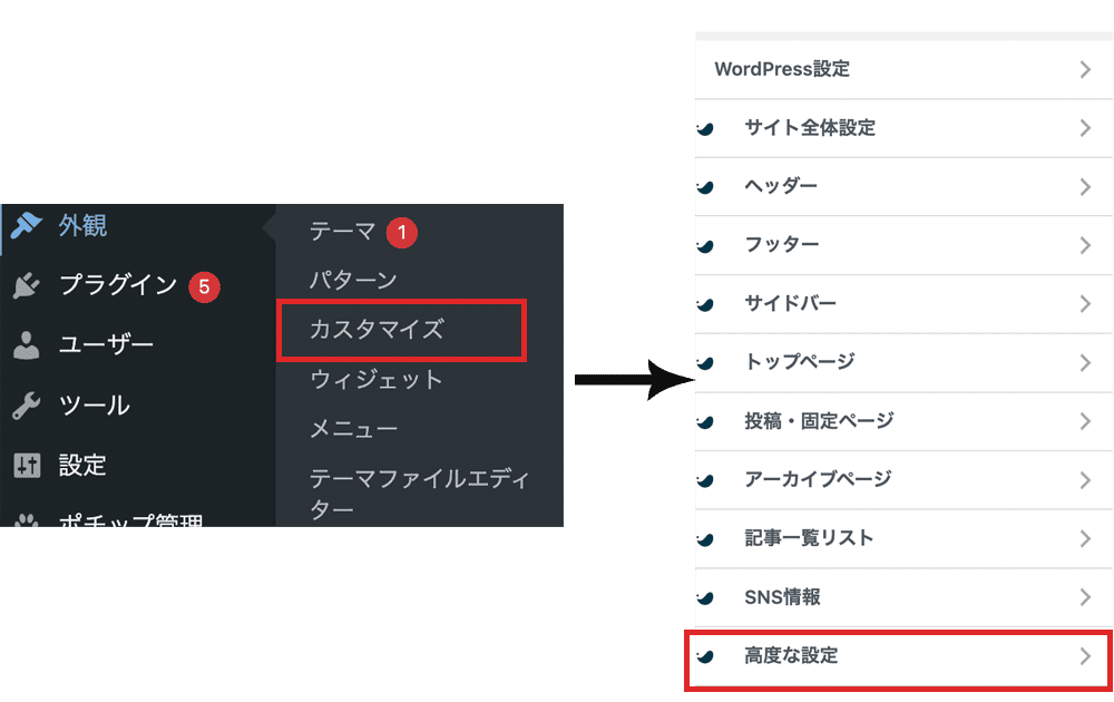WordPress管理画面で外観 > カスタマイズ > 高度な設定を選択