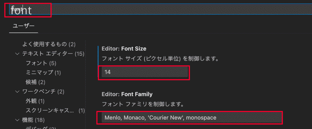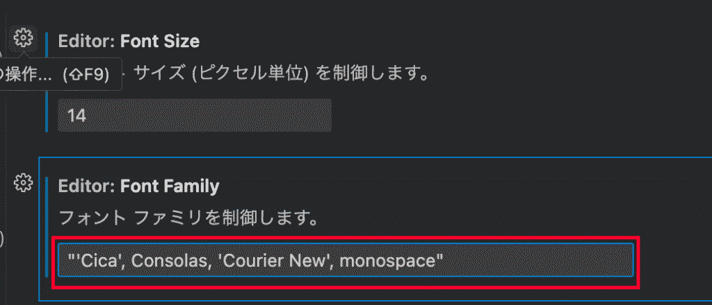 「Editor:Font Size」「Editor: Font Family」などの項目を編集