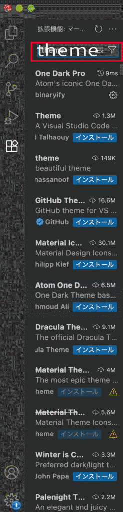 サイドバーの四角いアイコン(拡張機能)から「theme」と検索すると、世界中の人が作ったテーマがたくさん出てきます。