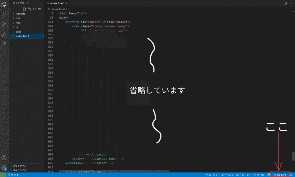 ❷ HTMLファイルを開いた状態で、右下の「Go Live」ボタンをクリックします。