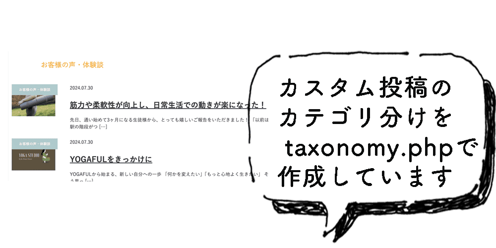 ❷ taxonomy-タクソノミー名.php →指定したカスタムタクソノミーの一覧を表示するテンプレートファイル
